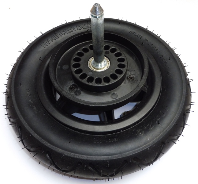 Achterwiel 10″ met as. Compleet, bestaande uit velg, binnen- en buitenband en lagers.